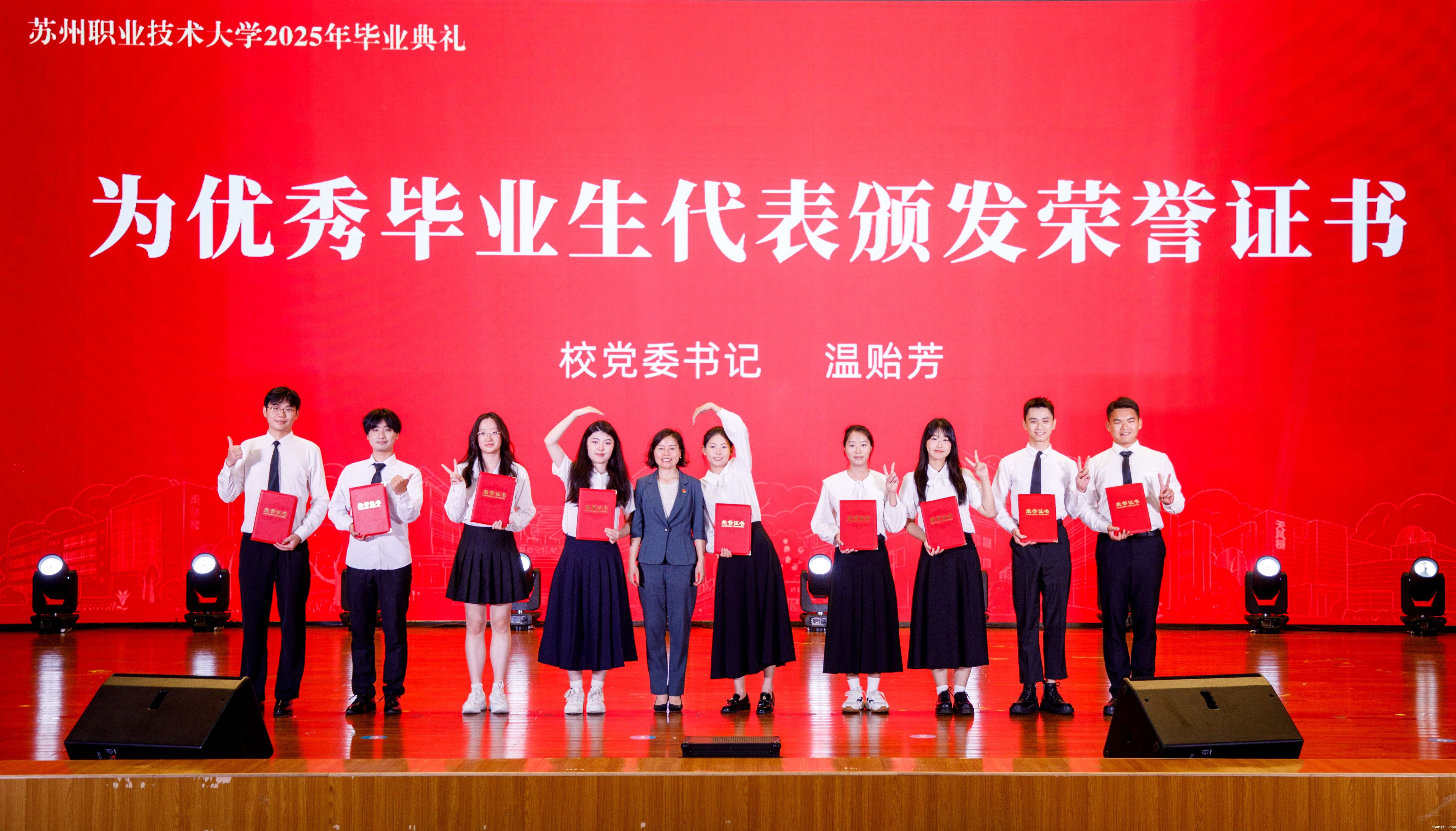 岁月如歌,青春如画,又到一年毕业季。6月21日,苏州职业技术大学2025年毕业典礼在图书馆剧场隆重举行。2025届毕业生代表怀揣着对未来的憧憬与对母校的眷恋,齐聚一堂共赴这场青春的荣耀之约,奏响属于他们的毕业华章。校党委书记温贻芳,校长陈峻,副校长孙学文,纪委书记庄剑英,副校长张军,副校长王峰,各学院(部)院长(主任)、党总支书记、副书记,各管理、教辅部门主要负责人,以及毕业班师生代表出席了典礼。