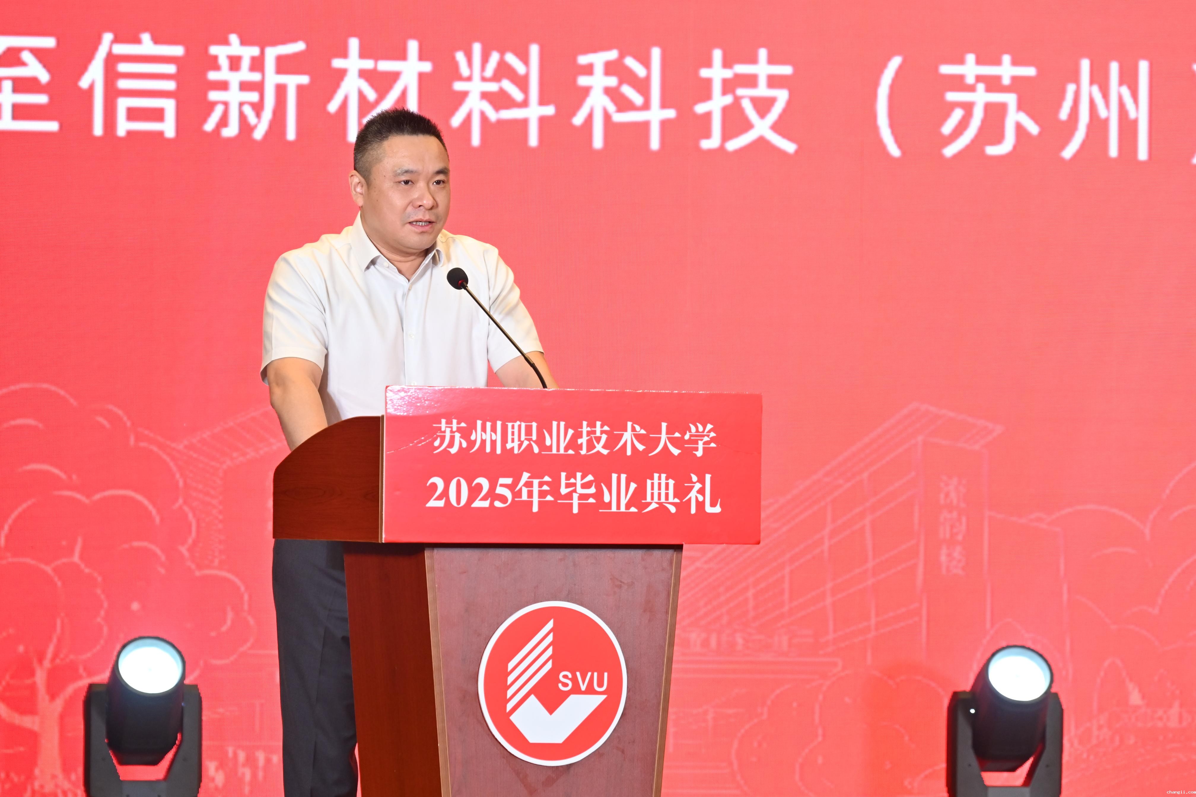 创至信新材料科技苏州有限公司总经理张烜作为企业代表发言。他在祝贺同学们顺利毕业的同时,结合在校求学和创业经历,讲述扎根行业的感悟。作为校友,他感恩母校的培养并寄语同学们要注重实践、勤于思考、持之以恒。