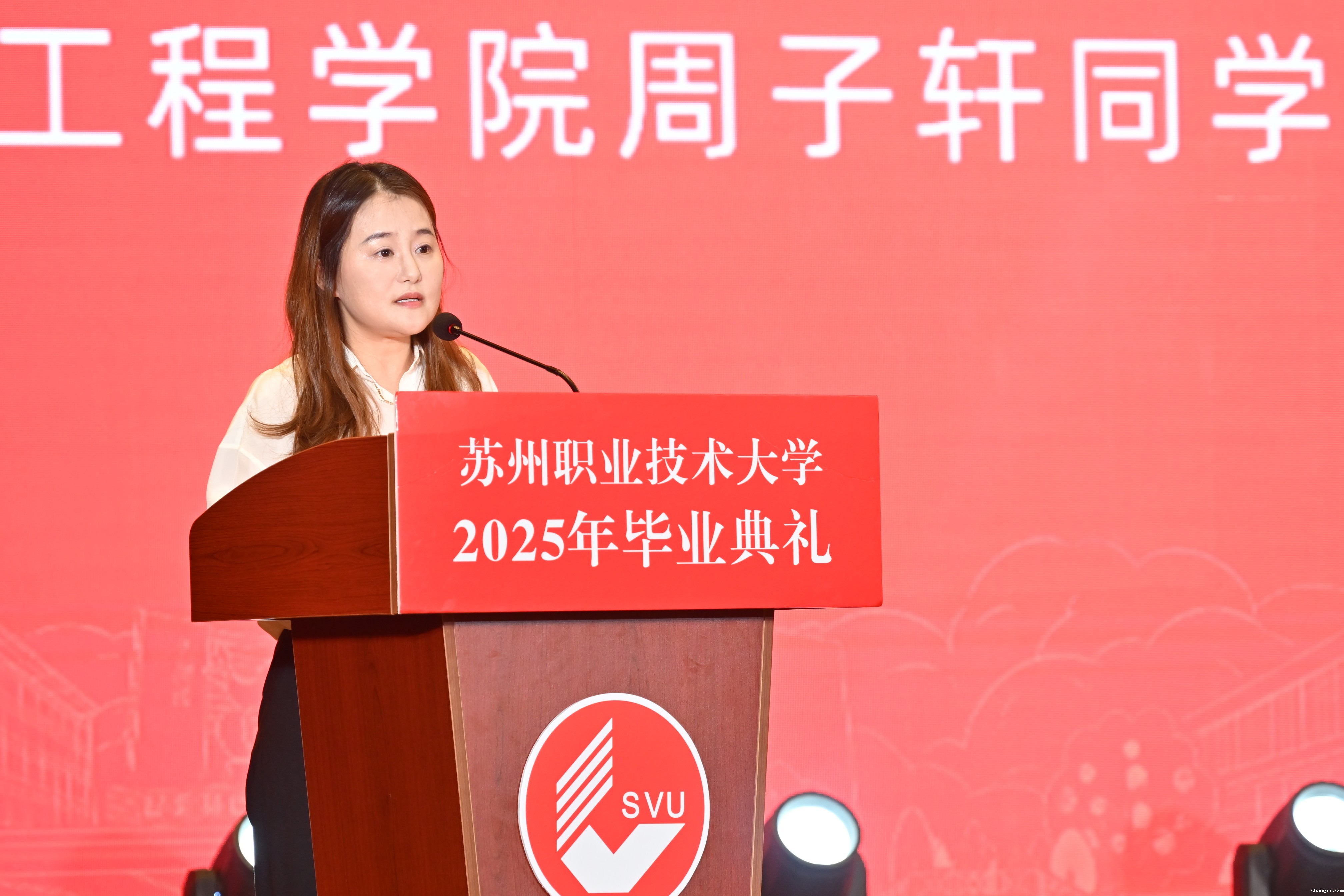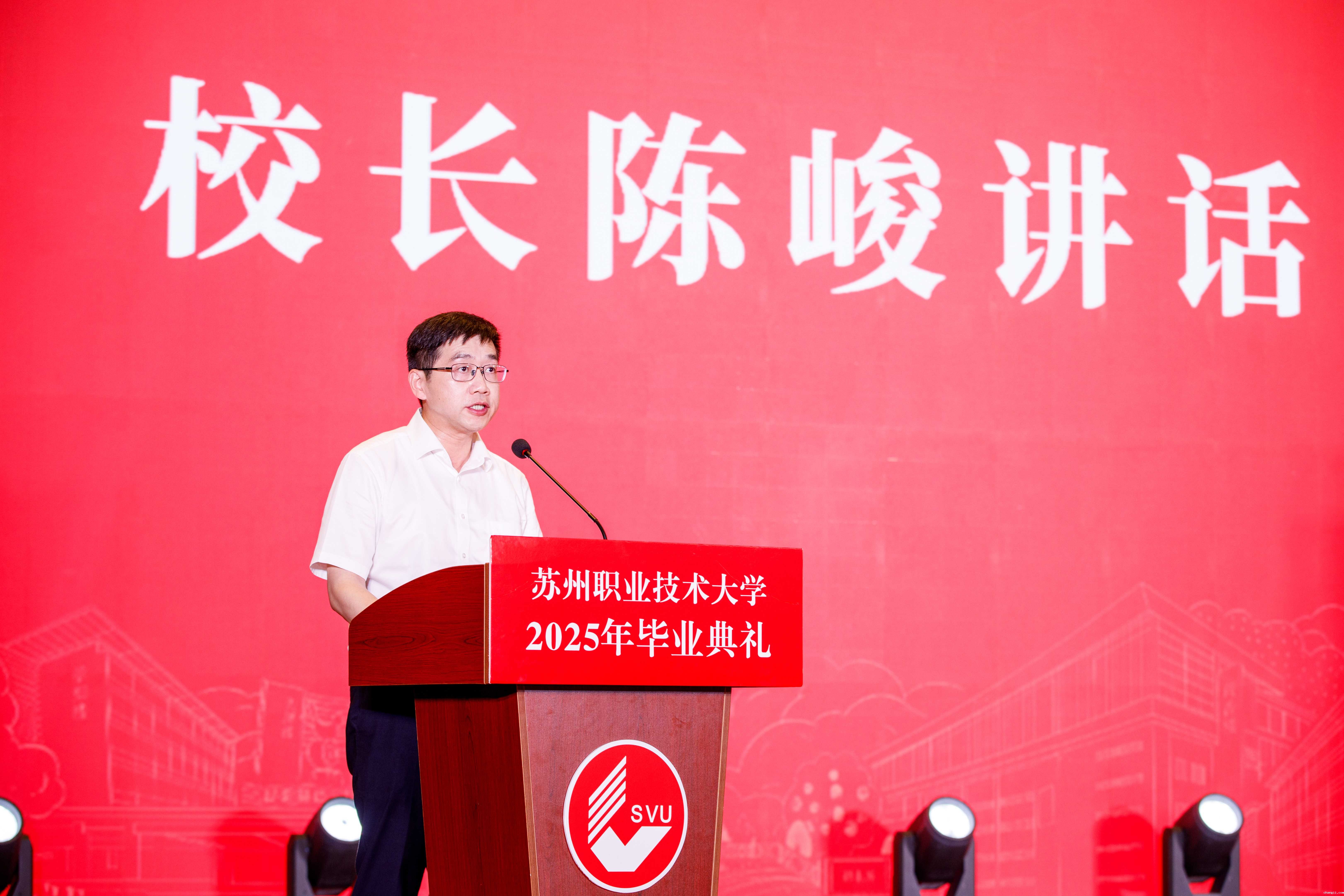 校长陈峻代表学校向圆满完成学业的毕业生同学致以最热烈的祝贺。他深情回顾了三年来同学们与国家共奋进、与学校共成长的难忘历程,并提到同学们不仅是教育部正式批准我校升格为职教本科这一历史性飞跃的见证者,更是耕耘者和贡献者。他盼望同学们作为苏州职业技术大学的第一批毕业生要坚定理想信念,做志存高远的追光者;坚守工匠精神,做精益求精的践行者;坚持奋斗不息,做勇往直前的开拓者。