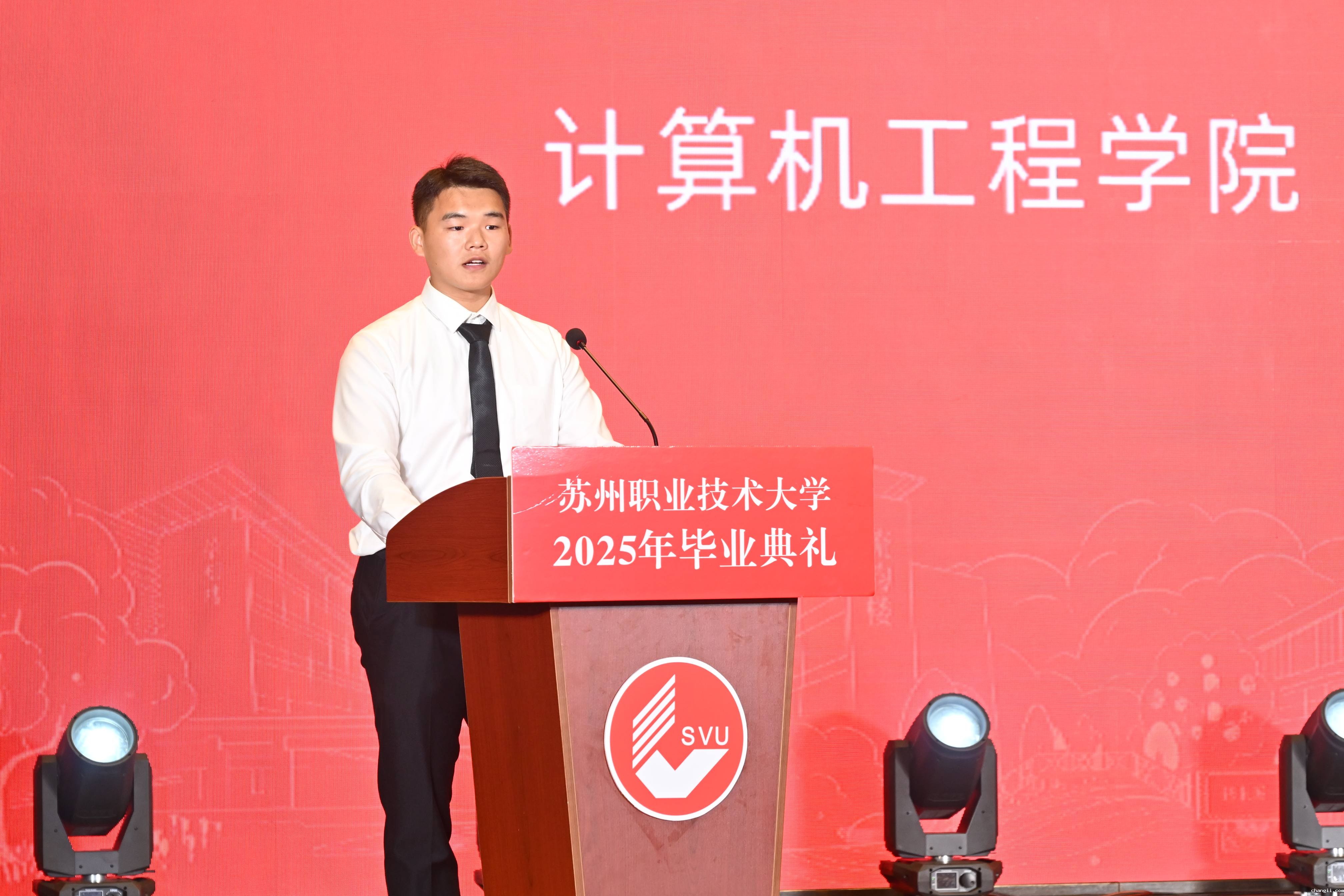 计算机工程学院顾羽同学作为优秀毕业生代表发言。他感恩学校的培养并呼吁同学们铭记,母校赋予的不仅是精湛的专业技能,更是“永不言弃”的工匠血性、“心怀家国”的赤子格局,以及作为“三高一创”人才的使命担当。